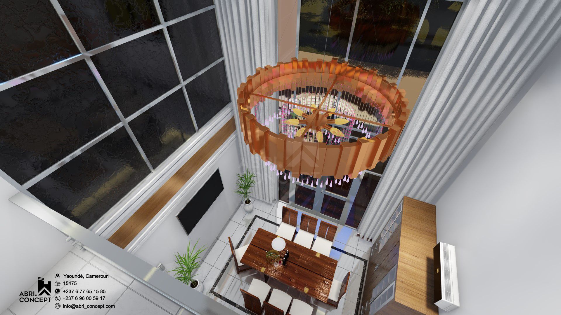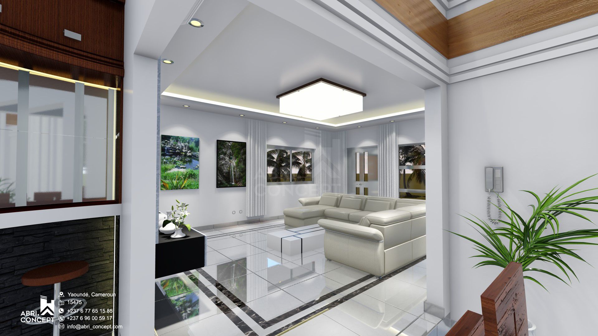 Option “Tropical Modern” : Incorporation de plantes vertes et de textures naturelles (rotin, terre cuite) pour s’adapter au climat de Yaoundé.